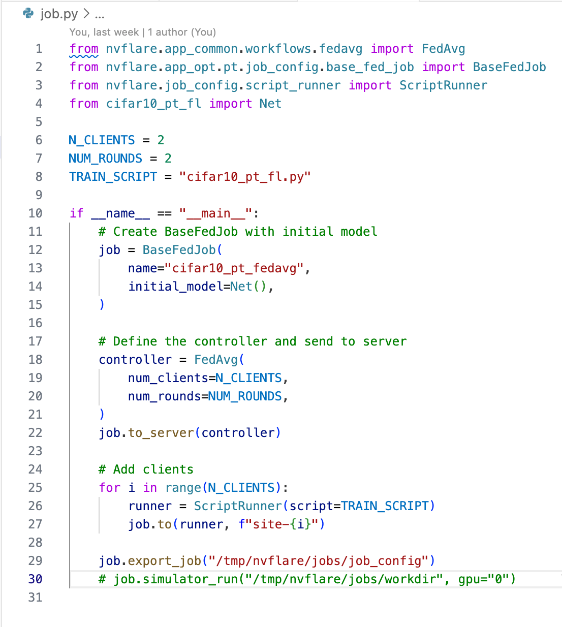 NVFLARE gives you a concrete structure for running federated learning as a coordinated “job” across a server and multiple clients. It standardizes how you package orchestration, local execution, and the artifacts exchanged between them, so FL runs like a repeatable system instead of a bespoke distributed project.