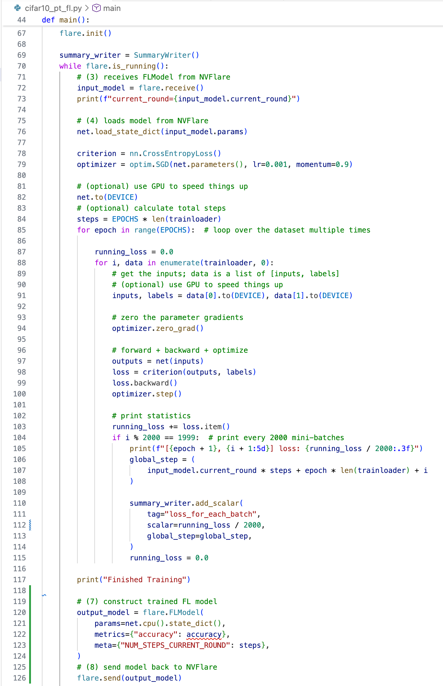 - Workflow / Controller (on the server): the server’s playbook. It defines the loop: when a round starts, which clients participate, what tasks get sent, when updates get combined, and whether to run evaluation.